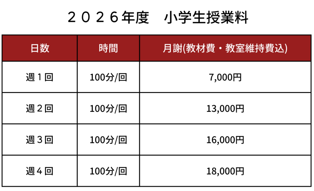 ※中学生以上は自習教室の維持、管理のため、教室維持費(月1,500円)が毎月の月謝に追加されます。(自習室は中学生以上が使用可能です。)