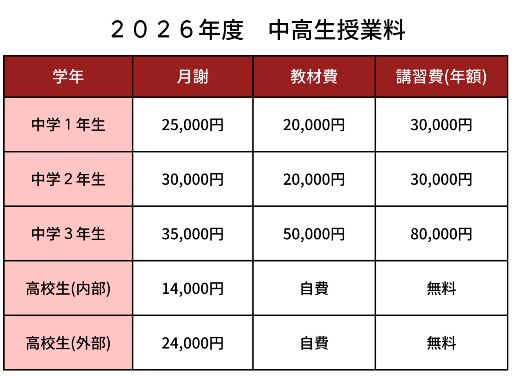 ※中学生は入塾時に3年間使用する教材費が追加でかかります。(10,000円)