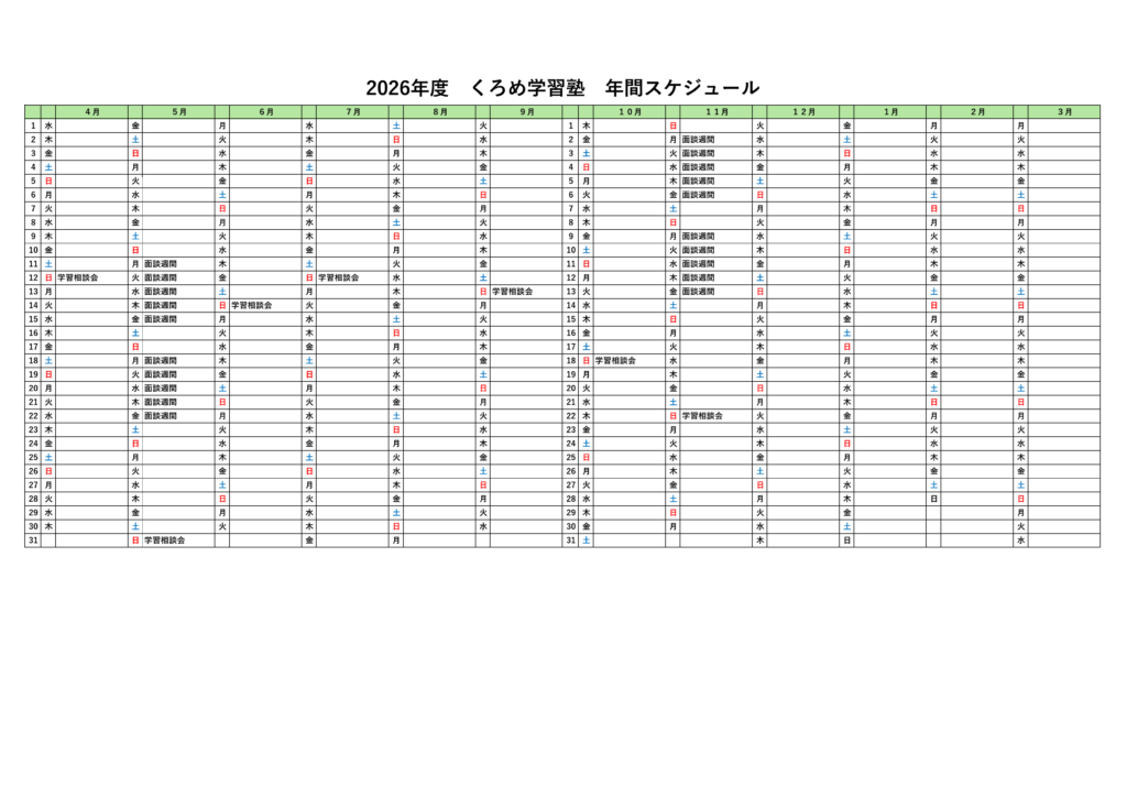 年間スケジュール(2026) 2026 3/20 スケジュール ブログ 2026年3月20日 ※随時更新 スケジュール ブログ よかったらシェアしてね! URLをコピーしました! URLをコピーしました! まだ間に合います。新中3募集。 4月のスケジュール この記事を書いた人 塾長 くろめ学習塾塾長の横田です! 授業に関する記事を中心に、卒業生のスポーツ観戦などプライベート?についてもちょこちょこ書いていきます! サッカー観戦とお洋服が好きです。 (最近服購入禁止令が出ているので我慢しています…) 関連記事 3/20(金)中1英文法チェック答え 2026年3月20日 4月のスケジュール 2026年3月20日 まだ間に合います。新中3募集。 2026年3月20日 高校受験は想像以上に複雑です。 2026年3月20日 3/19(木)中1英文法チェック答え 2026年3月19日 記録に残す。 2026年3月19日 都立国立高校に合格!R・Aくん 2026年3月19日 年間の面談予定。 2026年3月18日