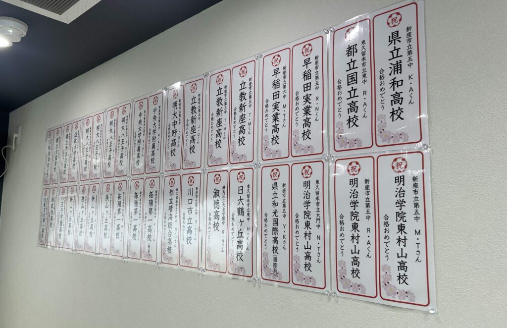 早速A館の2階に合格短冊を設置!受験生の健闘をたたえるとともに、来年以降に受験を迎える生徒たちの励みになればと思っています。本当に合格おめでとう! -